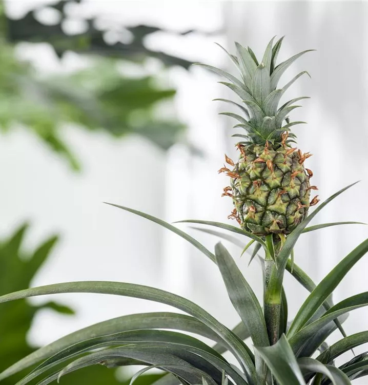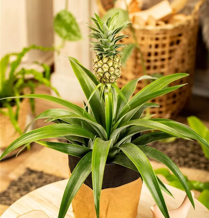 Der Artname Ananas comosus bedeutet wörtlich genommen „Die Frucht mit Schopf“. Tatsächlich besitzt die Ananas einen unverkennbaren Blattschopf. Als ausdauernde Zimmerpflanze ist die Ananas aber nicht nur wegen ihrer großen Frucht süß-sauren Aromas beliebt: Der Vertreter der Bromelien besitzt zudem auch ein apartes Äußeres und bildet mit seinen langen Blättern einen exotischen Blickfang.