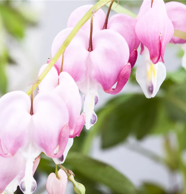 Dicentra spectabilis bildet in Trauben angeordnete, rosa-weiße Blüten ab Mai.