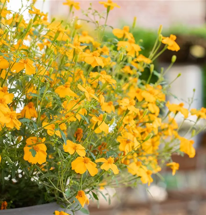 Die Studentenblume 'Gold Medal' (Tagetes) ist eine beliebte Pflanze für den Balkon. Die unzähligen Blüten erscheinen, je nach Sorte, in verschiedenen Farben die ganze Saison hindurch. Ein sonniger Standort und ein durchlässiges Substrat werden bevorzugt.