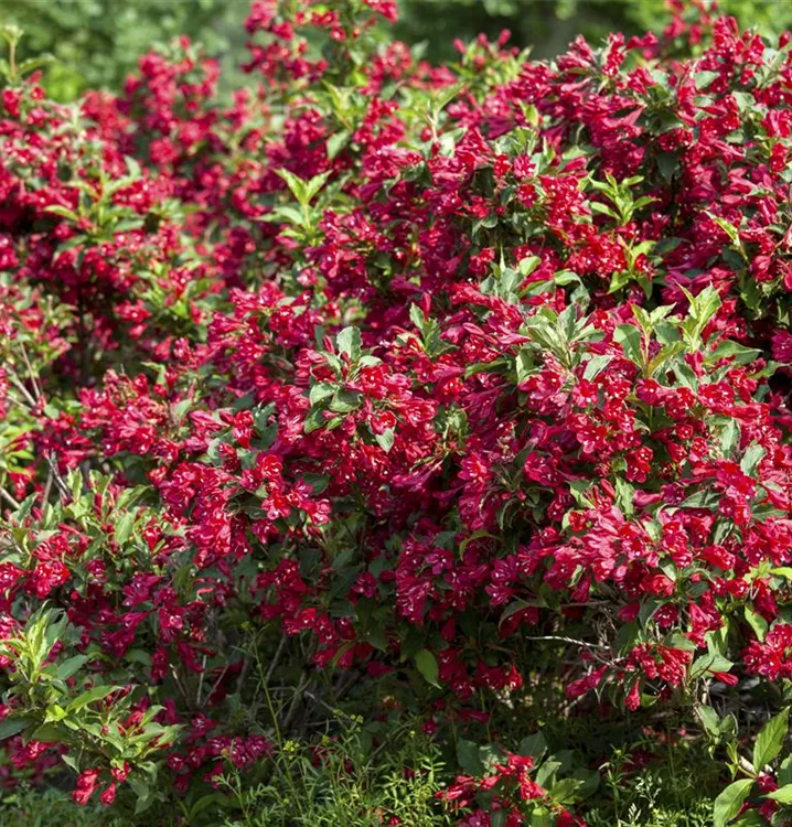 Die Weigelie 'Red Prince' (Weigela) ein kompakter Kleinstrauch, der, je nach Sorte, trichterförmige Blüten in verschiedenen Farben hervorbringt. An einem sonnigen bis halbschattigen Standort mit durchlässigem, lockerem, nährstoffreichem Boden erreicht sie gewöhnlich eine Höhe von ca. 2 m und wird ca. 2 m breit.