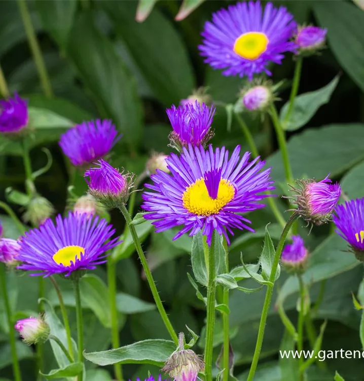 Erigeron 'Dunkelste Aller' bildet körbchenartige, violette Blüten ab Juni. Bei richtiger Pflege Nachblüte im September.