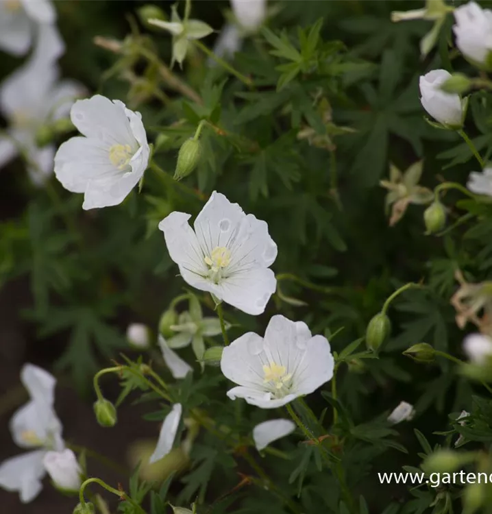 Geranium sanguineum 'Album' bildet schalenförmige, weiße Blüten ab Mai. Bei richtiger Pflege Nachblüte im September.