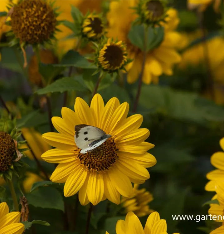 Helianthus decapetalus 'Capenoch Star' bildet körbchenartige, zitronengelbe Blüten ab Juli.