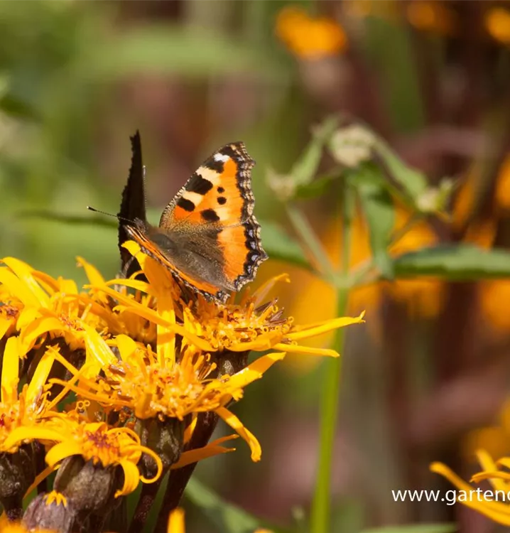 Der Strauß-Goldkolben (Ligularia dentata) ist eine buschige, aufrechte Staude, die von August bis September goldgelbe, körbchenartige, in Dolden angeordnete Blüten bildet. An einem sonnigen bis halbschattigen Standort mit durchlässigem, humosem Boden erreicht er gewöhnlich eine Höhe von ca. 1,2 m und wird ca. 80 cm breit. Der Strauß-Goldkolben ist gut frostverträglich.