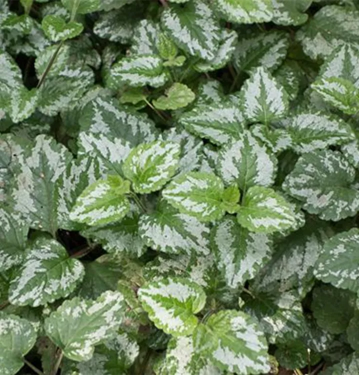 Hoher Blattschmuckwert. Die wintergrünen Blätter der Gewöhnliche Goldnessel 'Florentinum' sind silbrig, eiförmig, gesägt.