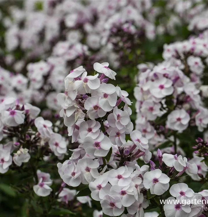 Phlox paniculata 'Ice Cream' bildet in Dolden angeordnete, weiß-rosafarbene Blüten ab Juli. Diese verströmen einen leichten Duft.