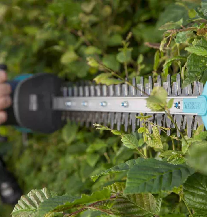 Die handliche und sehr leichte GARDENA Elektro-Heckenschere EasyCut 420/45 eignet sich besonders für den Rückschnitt kleinerer Hecken. Für eine ausgewogene Balance sorgt vor allem das kompakte Design. Dank des speziellen ErgoTec-Handgriffs lässt sich die Heckenschere optimal führen und eignet sich vor allem für seitliche Heckenschnitte. Die speziell geformten Messer sorgen für einen effizienten und sauberen Schnitt von Zweigen und dünnen Ästen. Die Motorleistung beträgt 420 W bei einer Messerlänge von 45 cm.