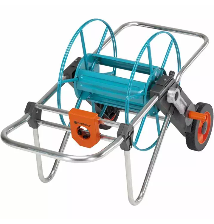 • große robuste Handkubel aus Alu-Druckguß für bequemes Aufrollen des Schlauches