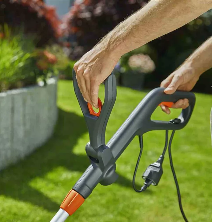 Lange Rasenkanten und schwer erreichbare Stellen im Garten werden mit dem handlichen und leichten GARDENA Elektro-Trimmer EasyCut 450/25 in Form gebracht. Der Teleskopstiel und der verstellbare Frontgriff sorgen für eine entspannte aufrechte Körperhaltung und erleichtern gleichzeitig die sichere Führung des Gerätes. Das Trimmen an schwer zugänglichen Bereichen wird durch den abwinkelbaren Stiel erleichtert. Der ausklappbare Pflanzenschutzbügel schützt Pflanzen, wenn nahe an Beeten und Rabatten getrimmt wird. Der GARDENA Elektro-Trimmer EasyCut 450/25 verfügt über eine Motorleistung von 450 Watt. Der Schnittkreis-Durchmesser beträgt 250 mm.