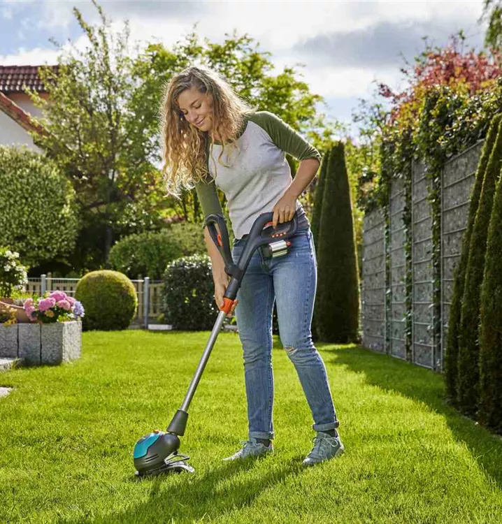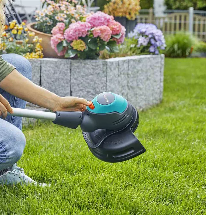 Für perfekte Rasenkanten und die Pflege von schwer erreichbaren Stellen im Garten ist der GARDENA Akku-Trimmer EasyCut Li-18/23 das Gerät der Wahl. Der leichte und handliche Trimmer ist mit einem Teleskopstiel ausgestattet. Der verstellbare Frontgriff sorgt für eine entspannte aufrechte Körperhaltung und erleichtert gleichzeitig die sichere Führung des Gerätes. Das Trimmen an schwer zugänglichen Bereichen wird durch den abwinkelbaren Stiel erleichtert. Der ausklappbare Pflanzenschutzbügel schützt Pflanzen, wenn nahe an Beeten und Rabatten getrimmt wird. Das RotorCut Schneidsystem mit langlebigen Kunststoffmessern schneidet besonders geräuscharm, präzise und sauber. Der Schnittkreis-Durchmesser beträgt 230 mm. Angetrieben wird der Rasentrimmer von einem pflegeleichten GARDENA System Akku mit 18 V und 2,6 Ah (Akku nicht mit inbegriffen). Dieser lässt sich jederzeit ohne Memory-Effekt wieder aufladen. Dem Akku-Trimmer liegen fünf RotorCut Messer bei.