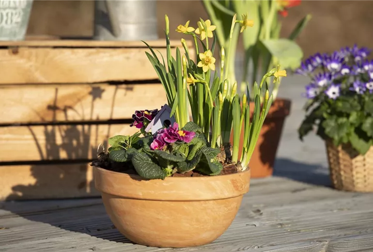 In den Pflanzschalen im Eingangsbereich oder auf der Terrasse lassen sich viele Dekoartikel mit den Pflanzen zusammen arrangieren. Ob Tonkrüge oder Keramiktiere, Holzstecker mit einem „Willkommens-Schild“ oder einem Osterhasen, Reisigzweige mit winterlichem Schmuck – der Fantasie sind hier keine Grenzen gesetzt. Das alles lässt sich unkompliziert und schnell erneuern und bildet einen Hingucker für die Gäste, die den Hauseingang betreten.