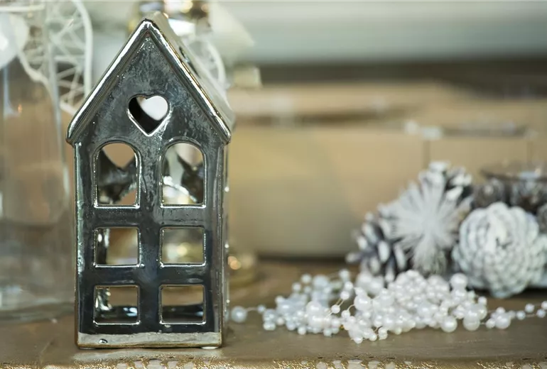 Oft ist neben der Haustür noch etwas Platz. Eine große Vase mit Zweigen, dicken Kugeln und Watte-Schneeflocken geht immer. Oder haben Sie noch einen alten Kinderschlitten parat? Den kann man als Abstellfläche für winterharte Pflanzen wie Erika, kleine Gesteck-Arrangements, Tannenzapfen und Figuren nutzen. Alles ein bisschen nett über- und nebeneinander drapieren und hier und da eine Schleife zufügen, und der Gast freut sich über einen freundlichen Empfang gleich an der Haustür, den in der kalten Jahreszeit nicht jeder bietet.